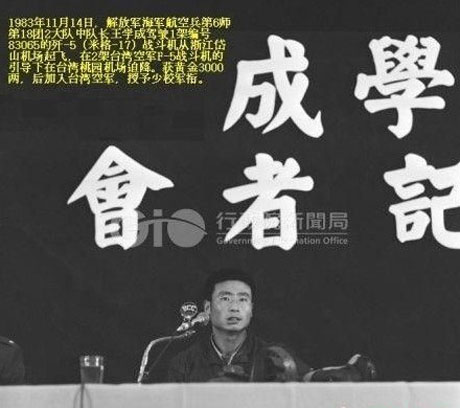 王学成获得黄金3000两,后加入台湾空军,授予少校军衔。图为叛逃的王学成受到台湾空军上将郝伯村的接见。