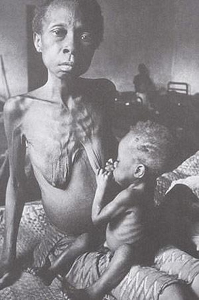 尼日利亚儿童恶性营养不良症。当尼日利亚东部的伊博人1967年宣布独立时,尼日利亚政府封锁了这个新兴的国家——比夫拉。在3年战争中,超过100万人死亡,主要是死于饥饿。在饥荒年代,儿童由于缺乏蛋白质而患上恶性营养不良症,导致肌肉萎缩,肚子凸出。