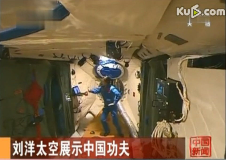 26号晚上是刘洋在天宫一号值守的第二个大夜班,在忙完工作后,她利用值夜班间隙,展示了一段中国功夫。
