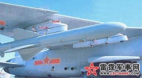 歼轰-7最重要的武器是C-801K/803反舰导弹,最多可带4枚。右图为两枚C-801导弹,颜色不同可能代表其型号不同。两个翼尖挂架可挂霹雳-5近距空空导弹。歼轰-7也是解放军中少有的带有翼尖挂架的飞机。图为齐射霹雳-5导弹。