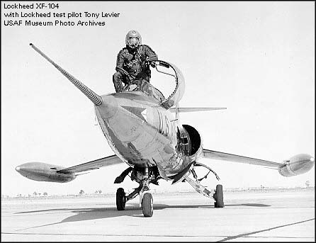 XF-104是根据1953年3月11日签定的合同研制的原型机,共有2架。由于原来计划采用的J79发动机的研制进度赶不上飞机试飞的需要,所以XF-104装备的是XJ65-W-6发动机,军用推力为3,540千克,加力推力为4,630千克。第1架(首飞时发动机还没有加力装置)和第2架原型机分别于1954年2月28日和10月5日首飞。装备1门固定式的20毫米M61“火神”6管炮,有2个外挂架。第2架原型机于1955年4月在试飞中坠毁,第1架原型机于1955年10月交付给空军,1957年7月也在试飞中坠毁。